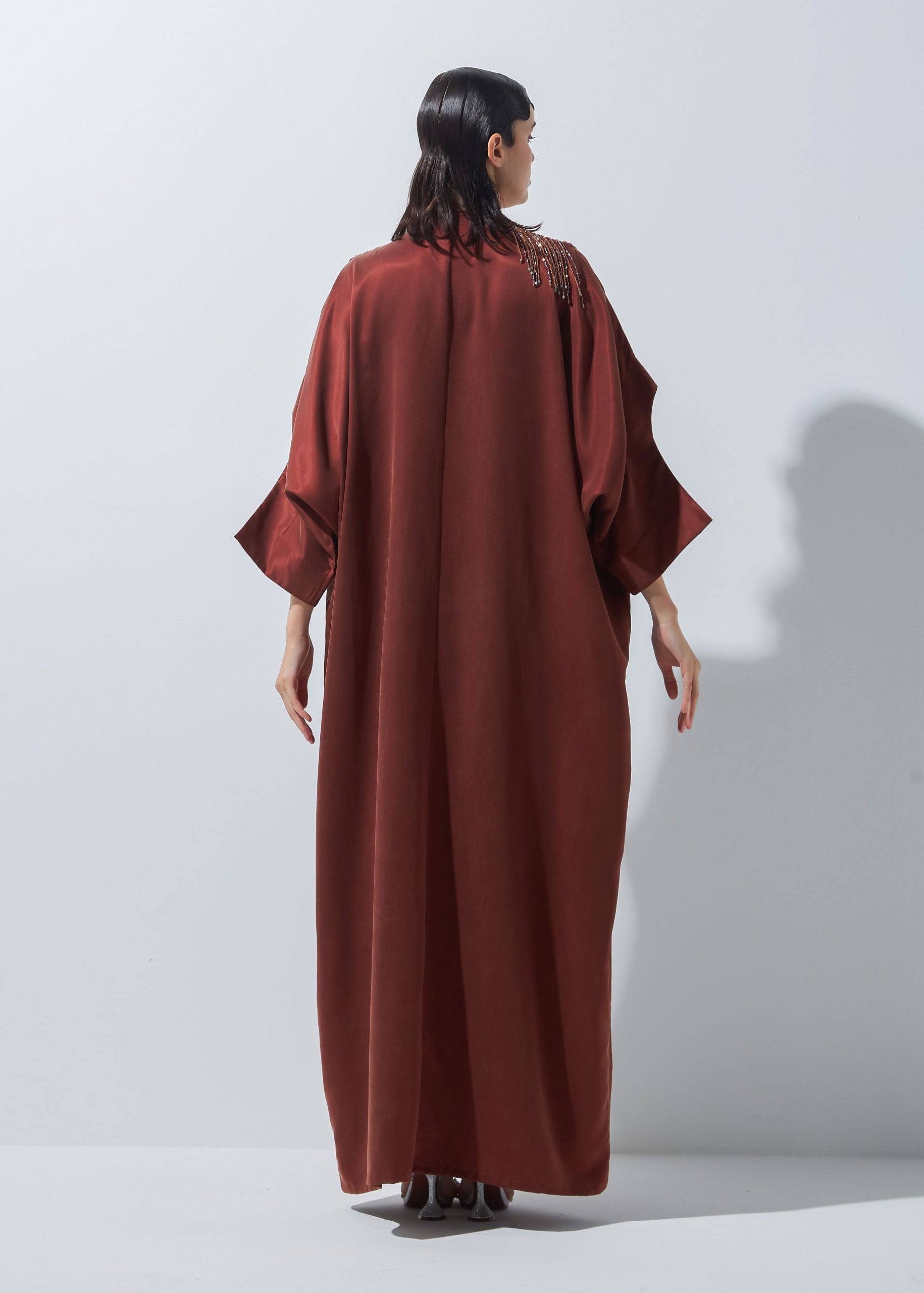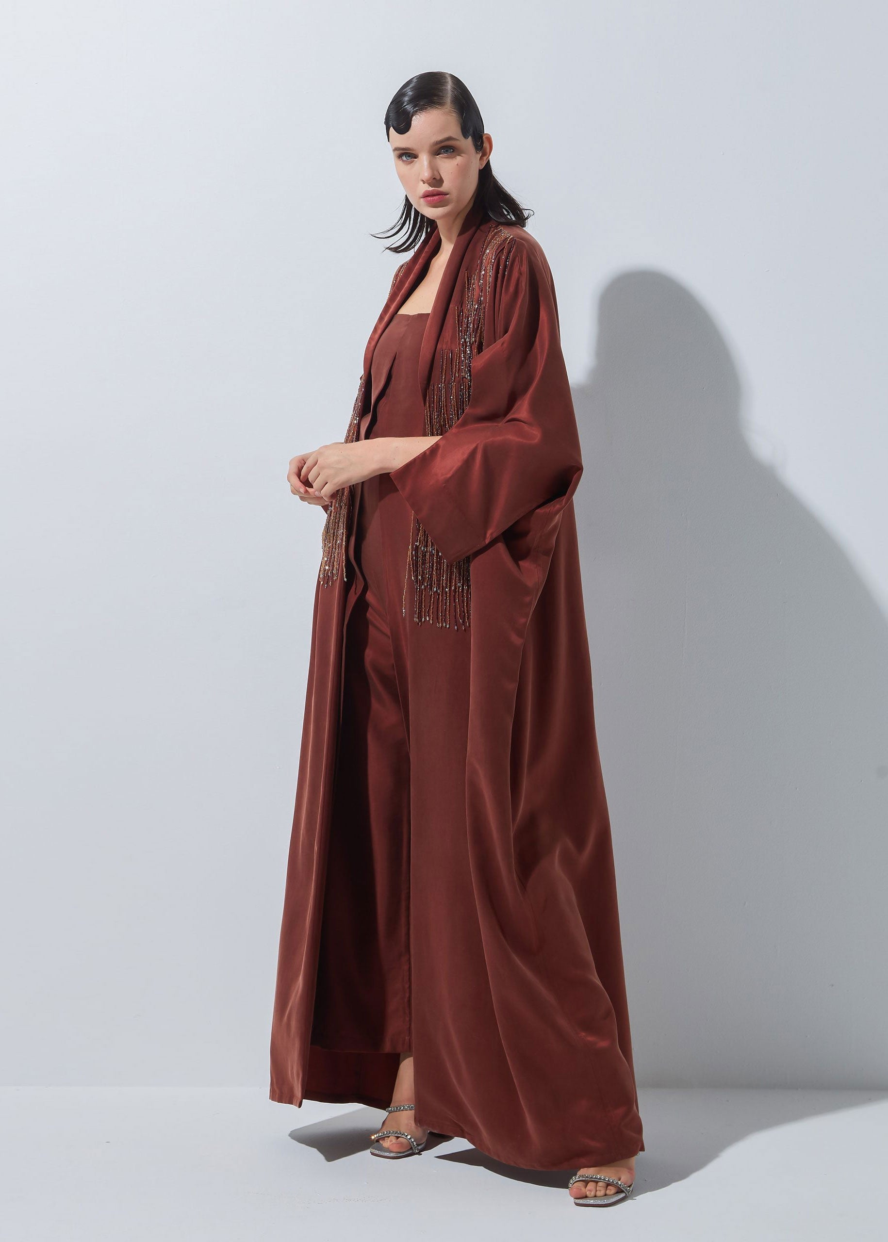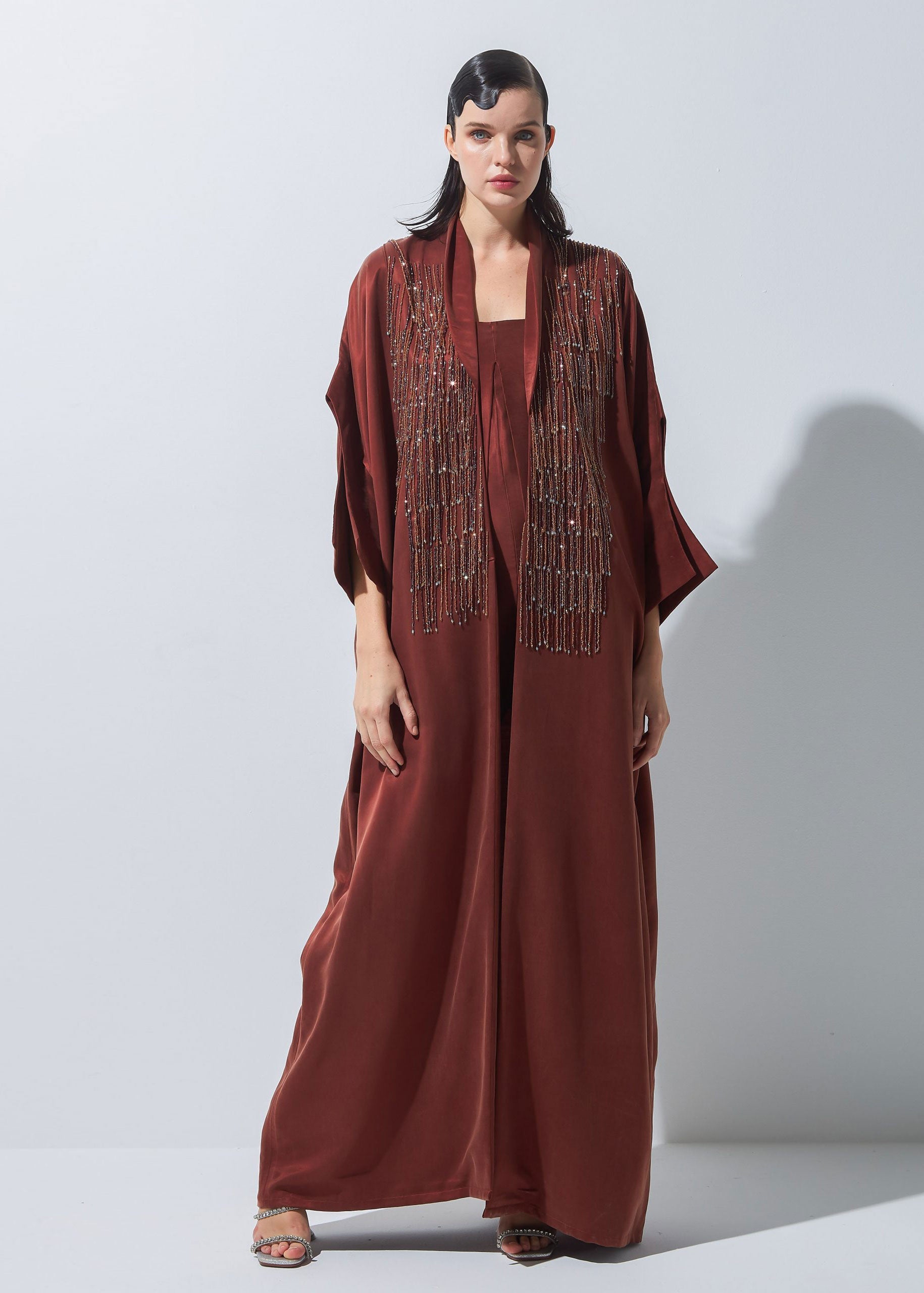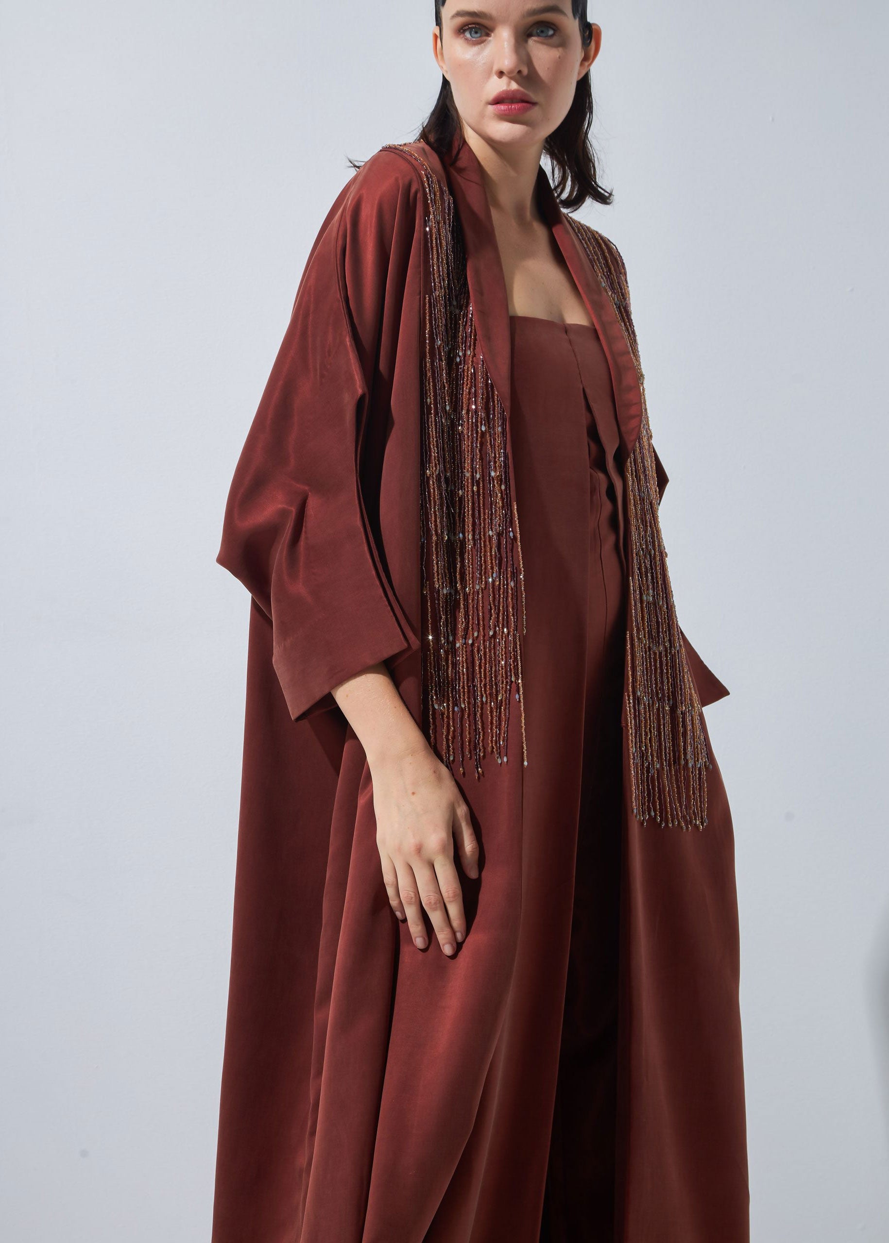 - السترة لها أكمام طويلة وواسعة ومصممة على الجانب الأمامي مع هامش من الخرز.