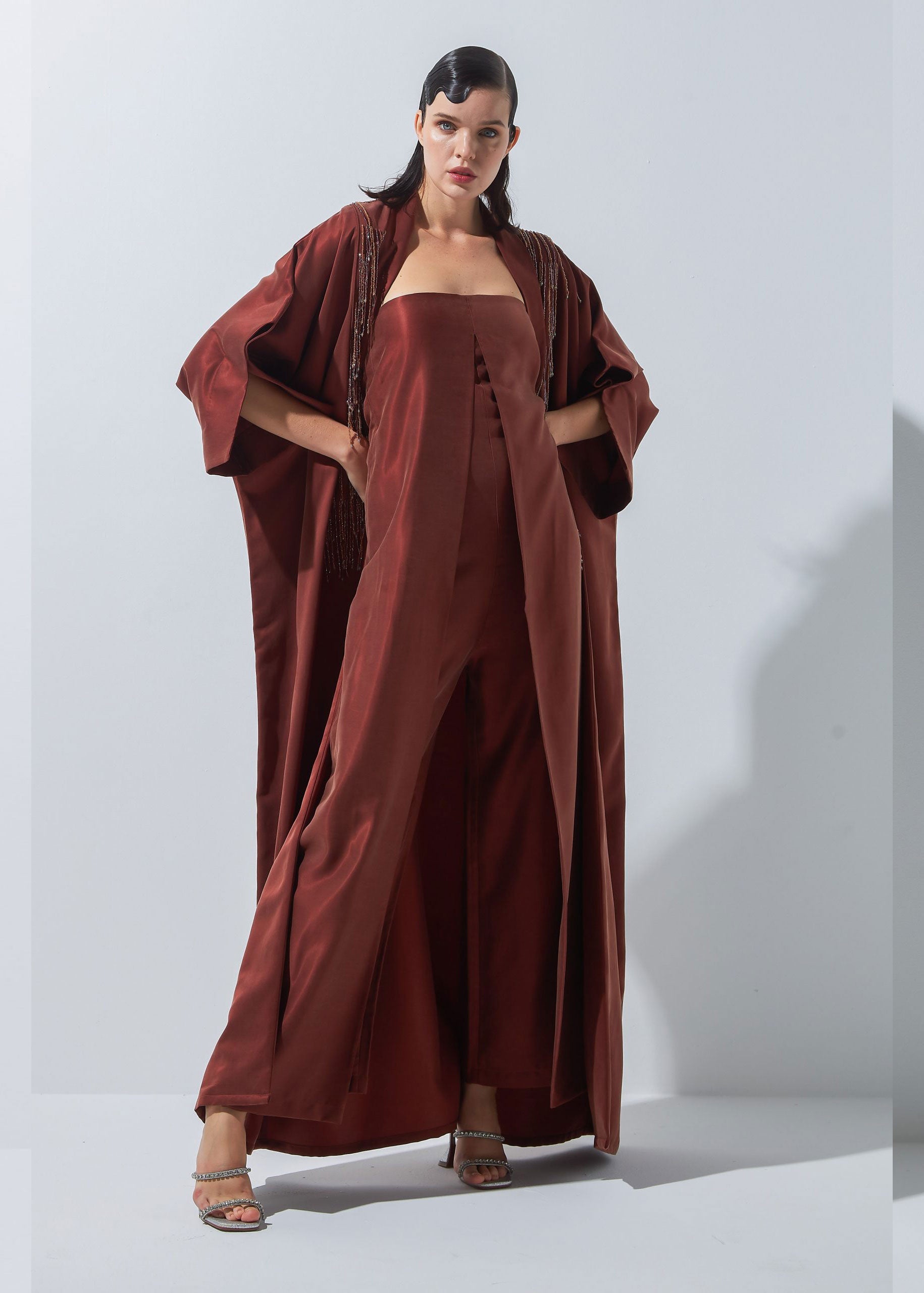 - مجموعة أنيقة مكونة من قطعتين تتضمن جمبسوت بدون حمالات وسترة طويلة.