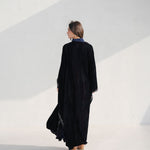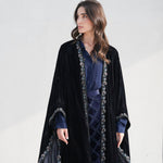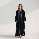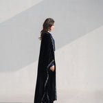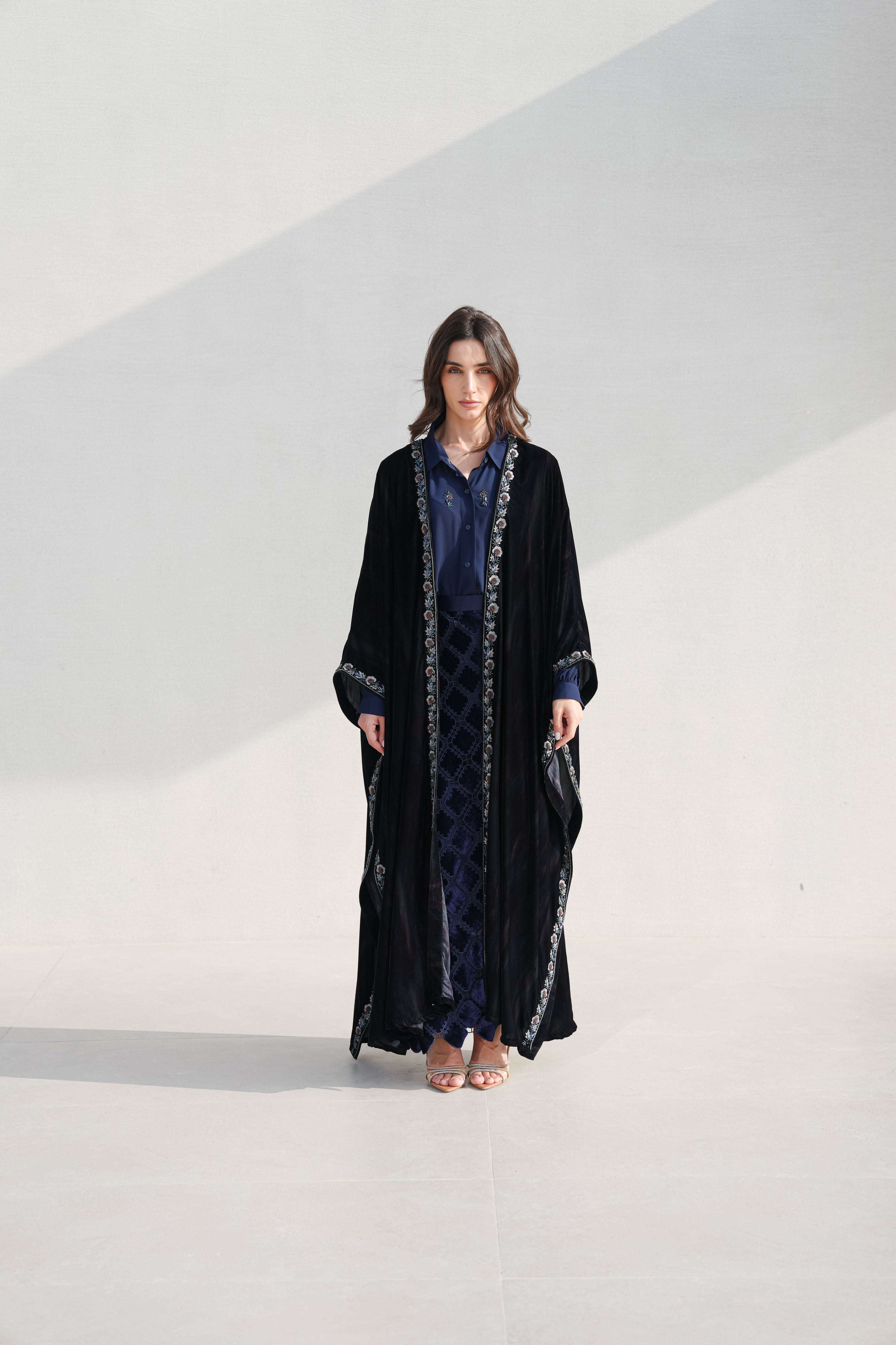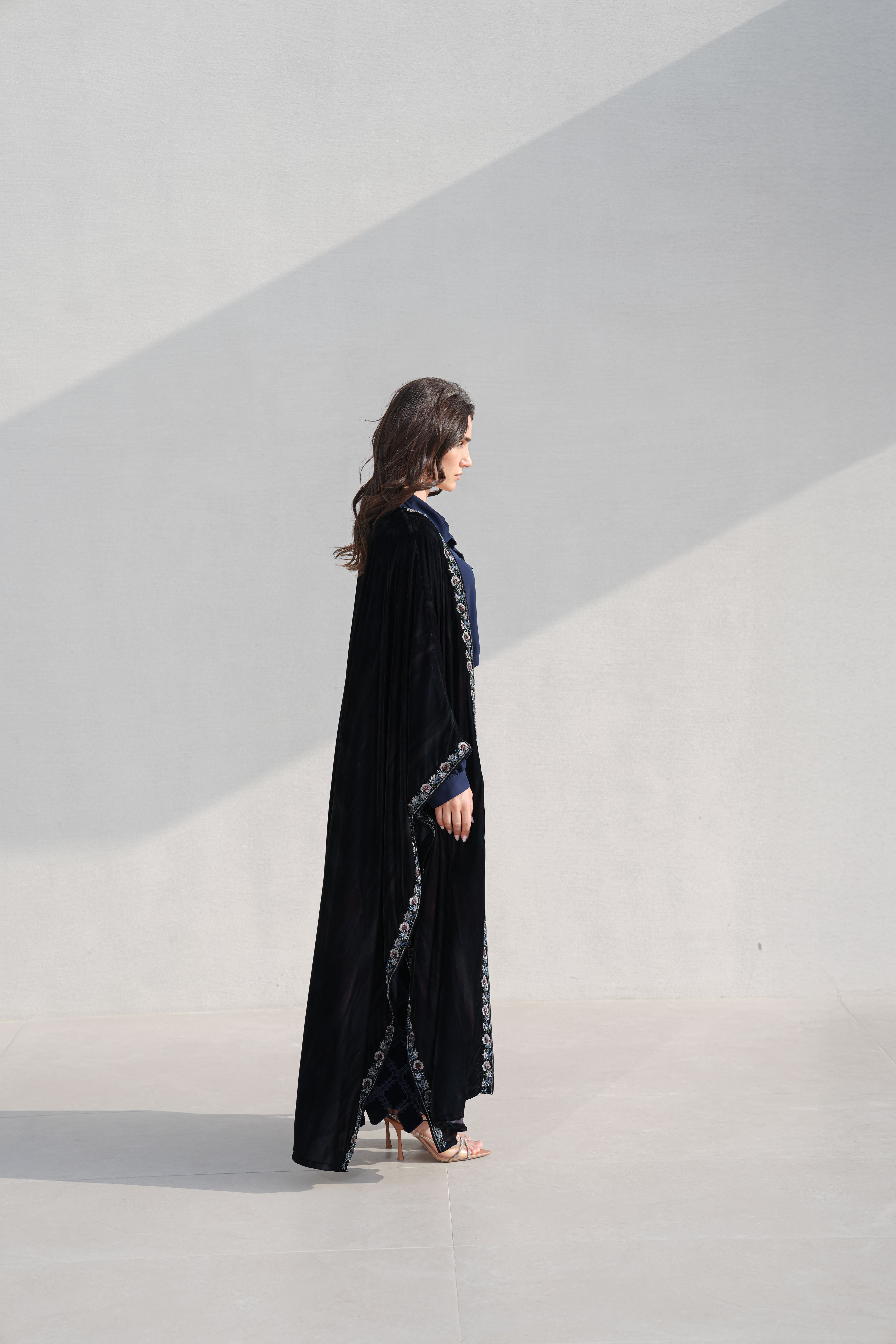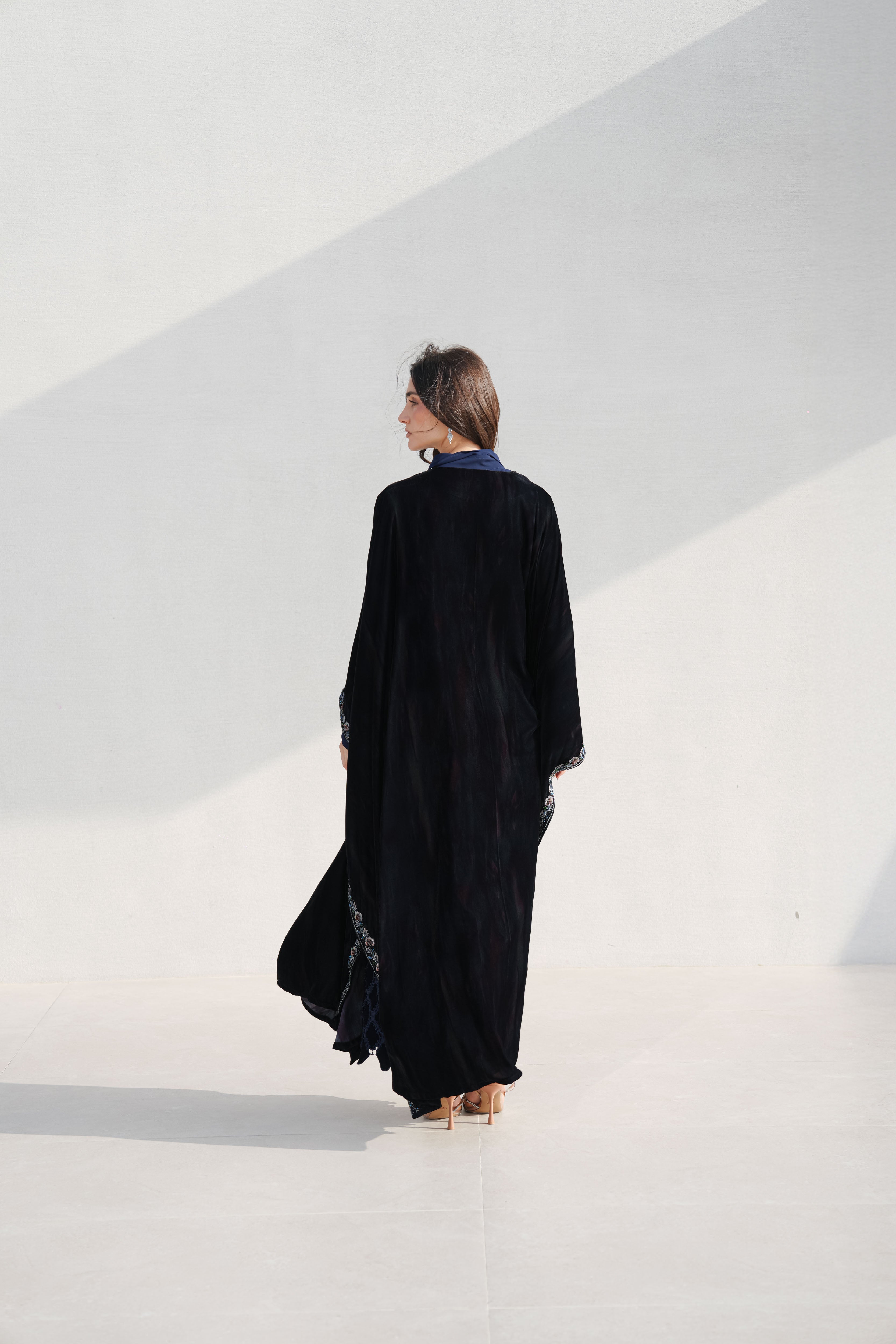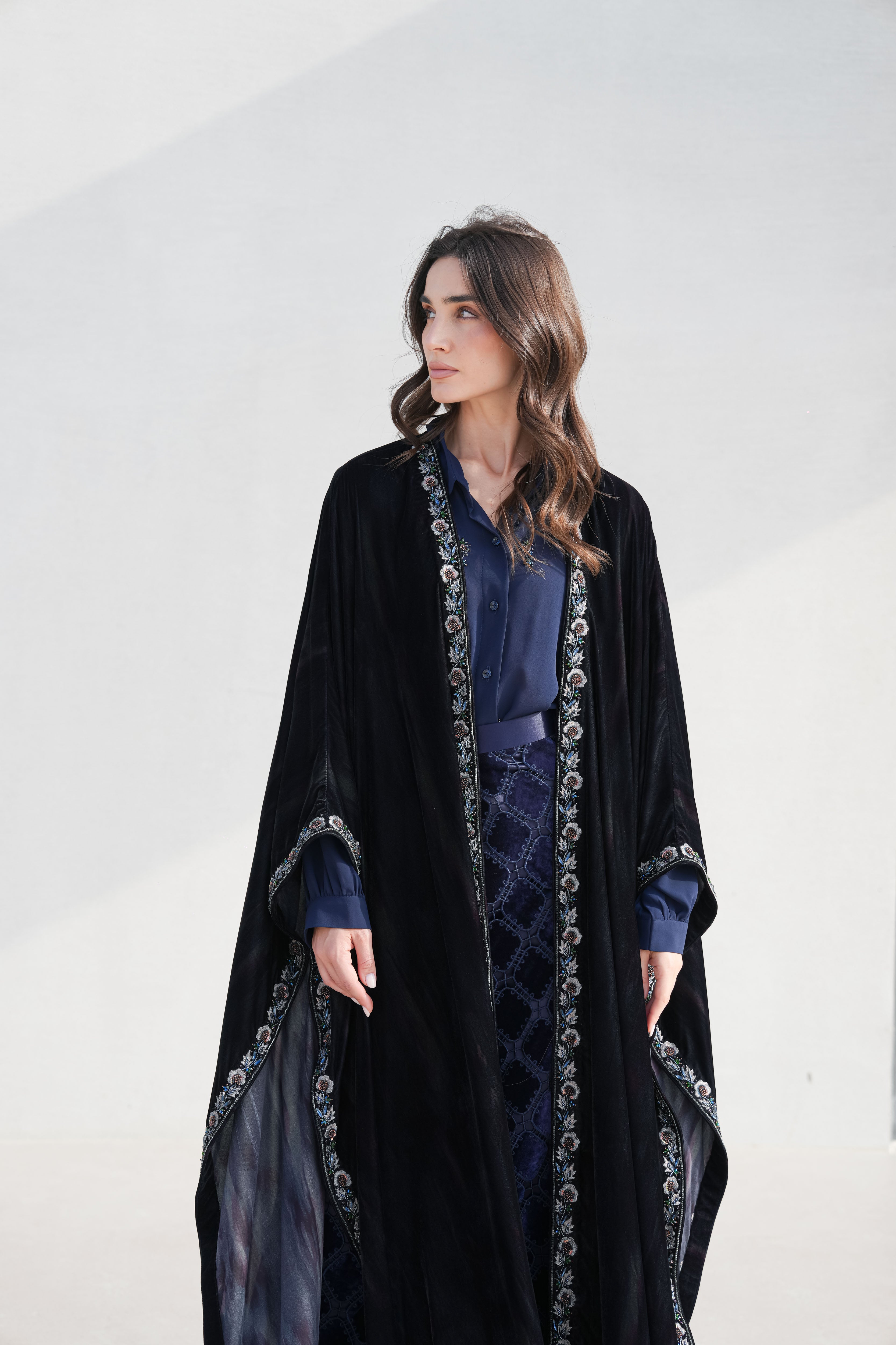 The abaya is cut in a sweeping silhouette, the velvet absorbing light rather than reflecting it. A trailing border of hand-embroidered botanicals runs the full length of the opening, dusty rose and slate blue placed against the dark ground with precision. The interior layers in navy silk and geometric jacquard, a complete world beneath the outer one. Every element considered, nothing decorative without purpose.