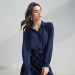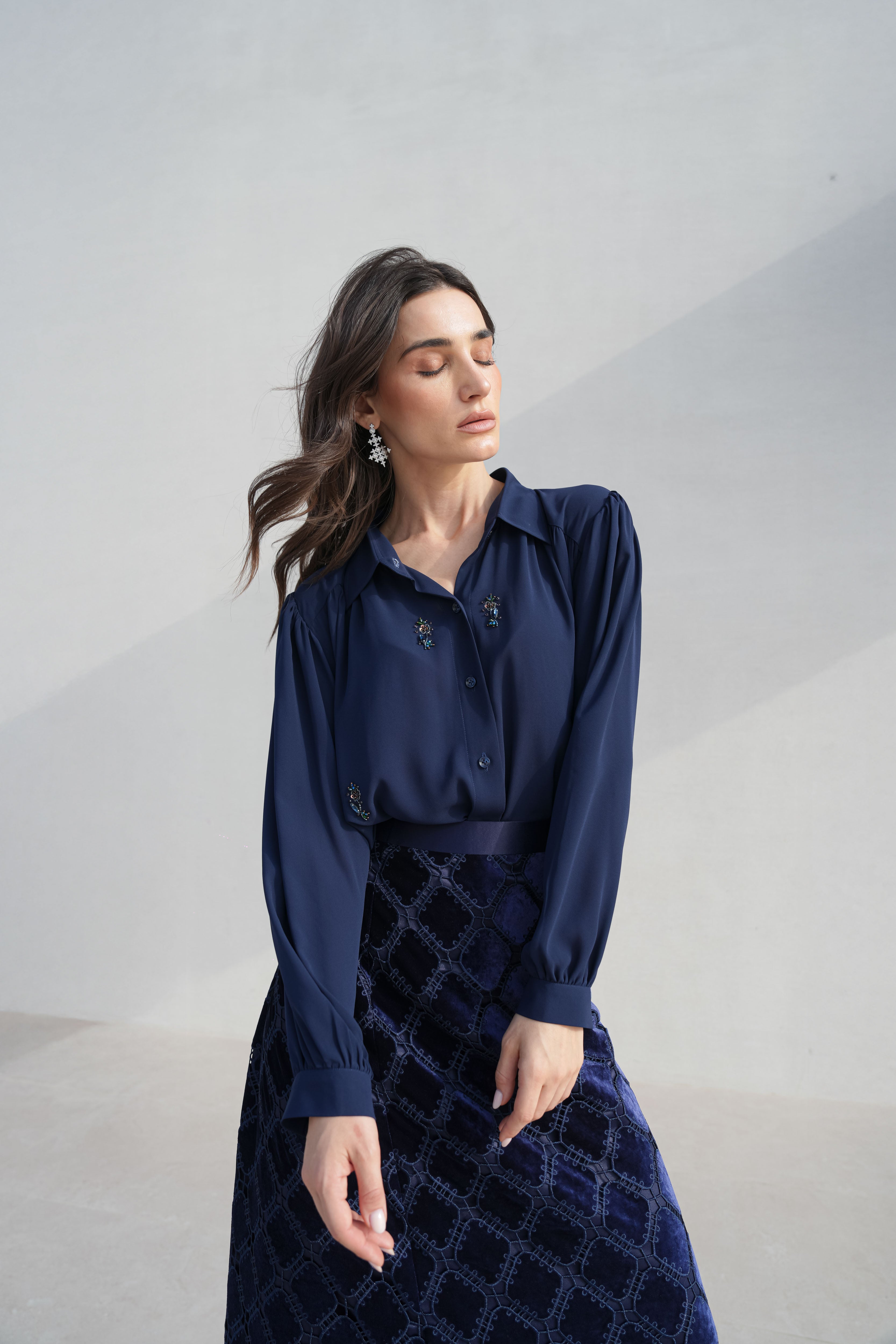 Dark blue velvet that moves like nightfall, unhurried. Florals embroidered at the border in dusty rose and slate, as if the garden stopped at the edge and knew to. Beneath it, navy and geometric shadow.
