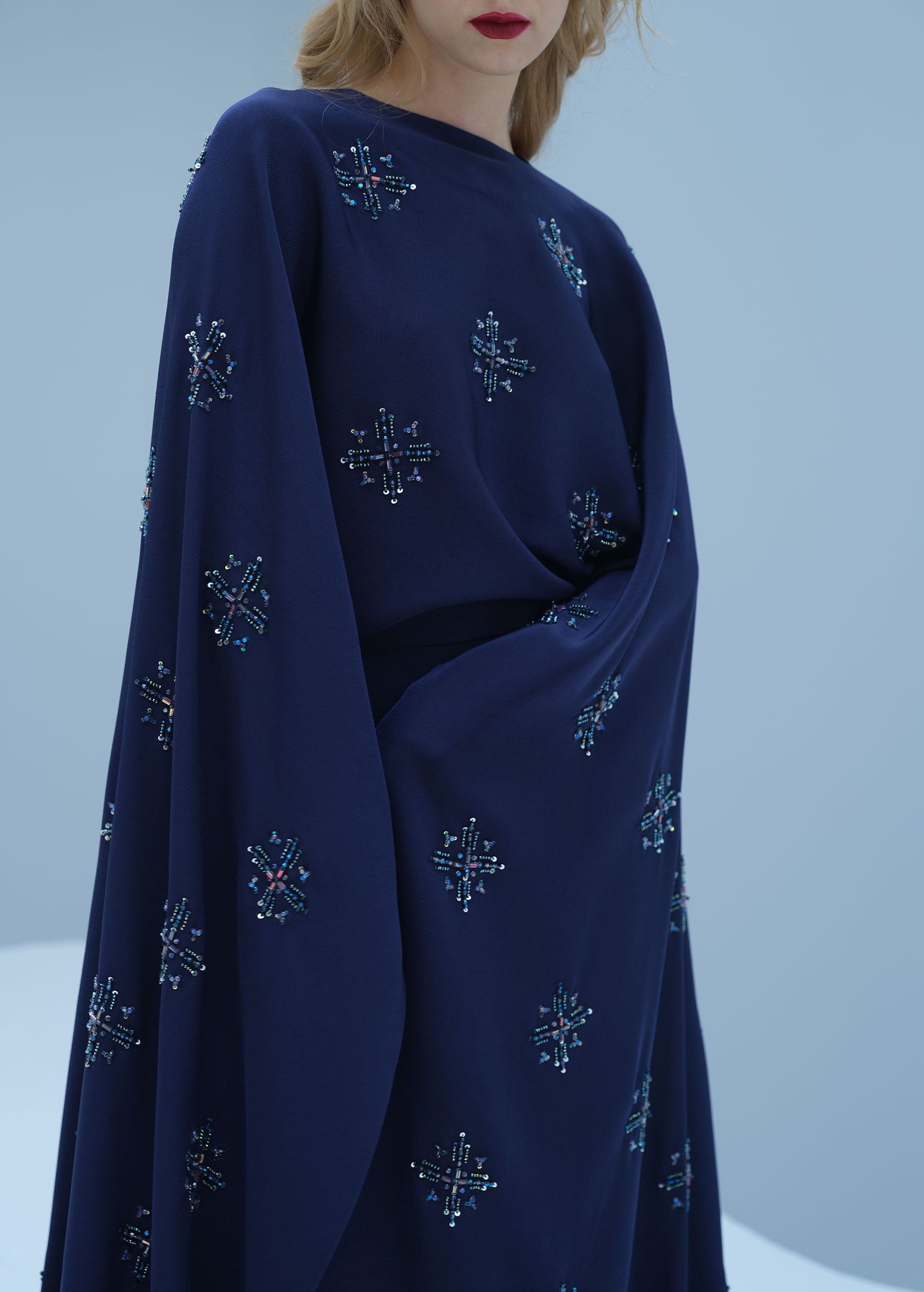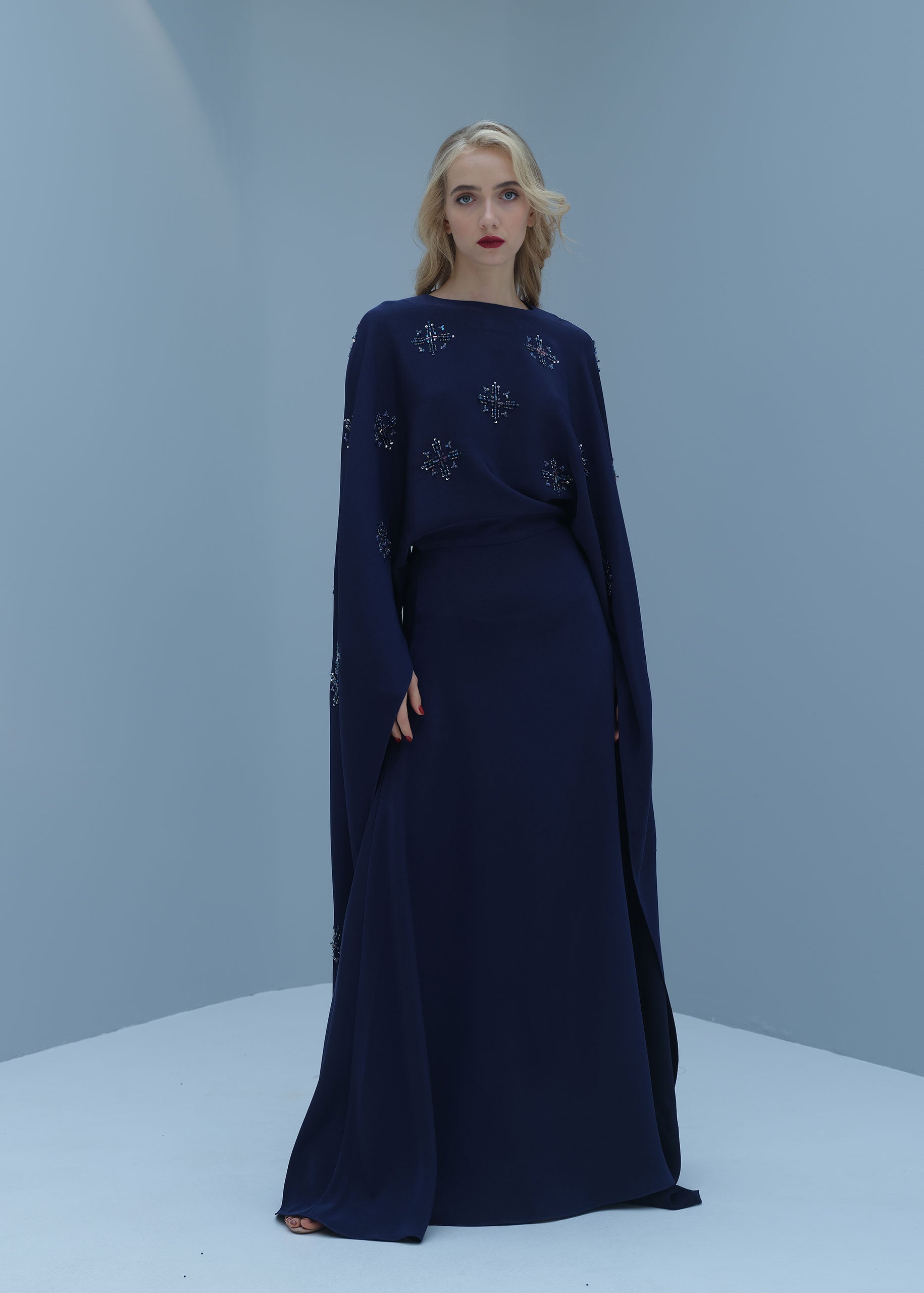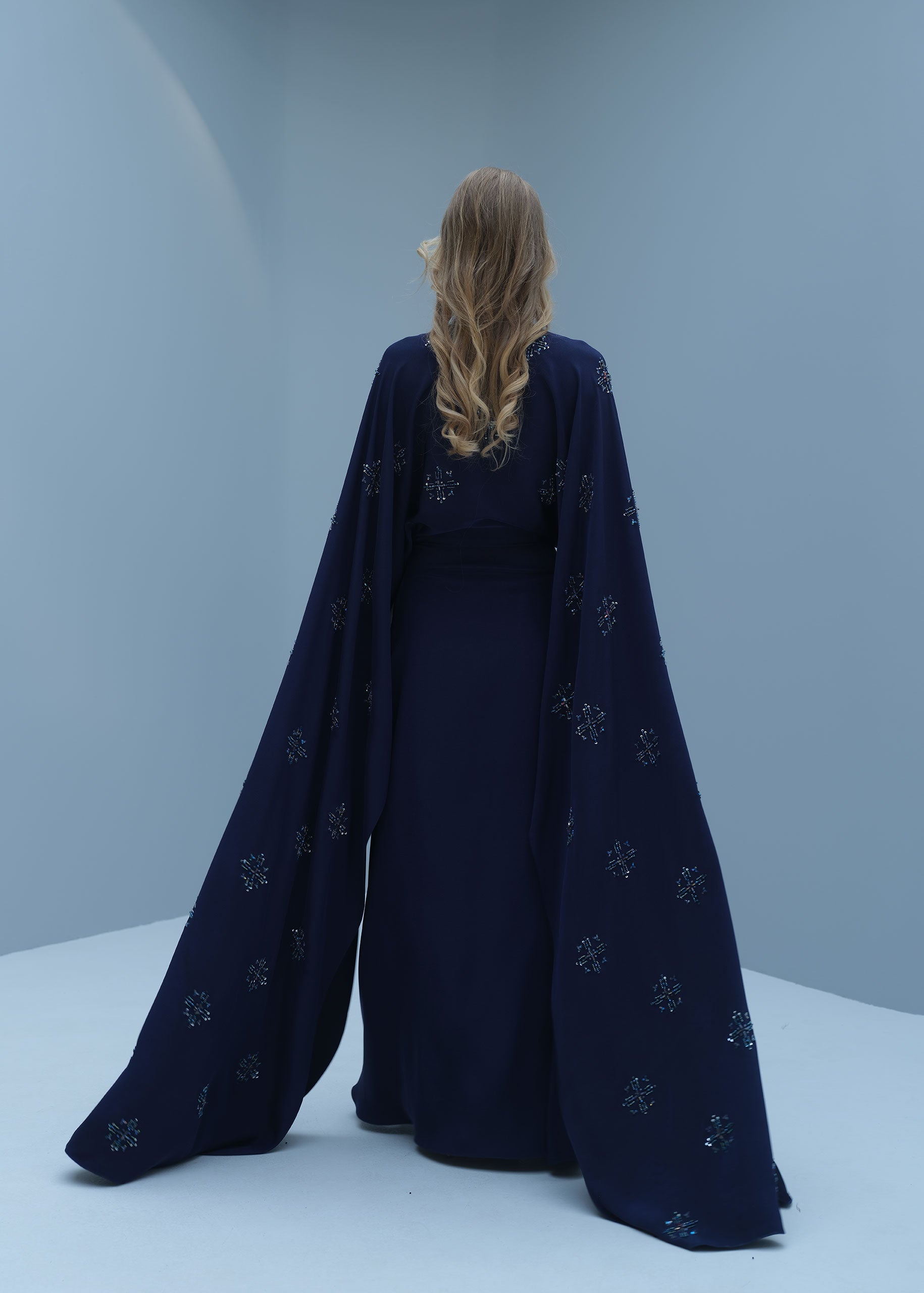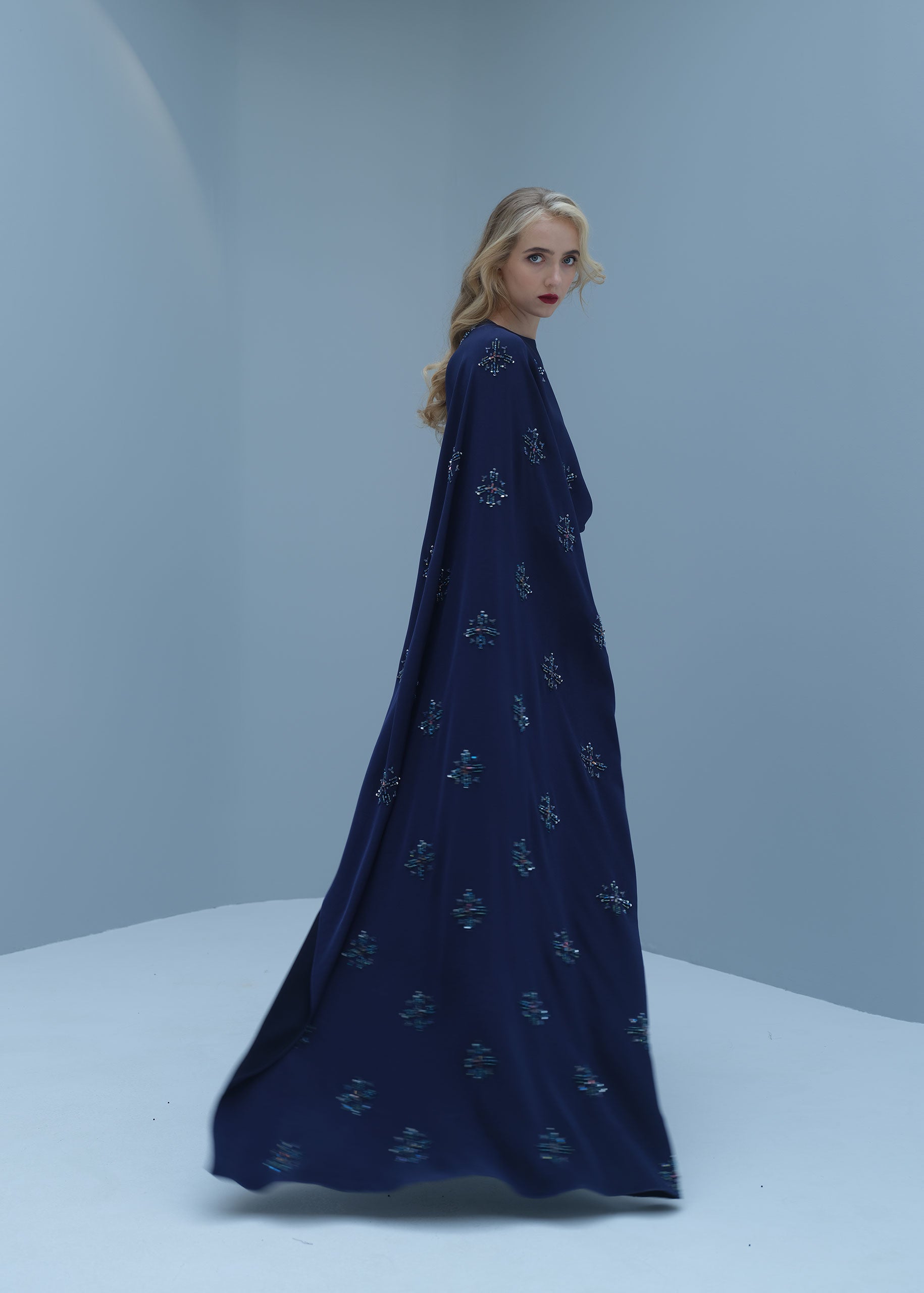 An exquisite royal crepe kaftan in a captivating midnight blue hue.