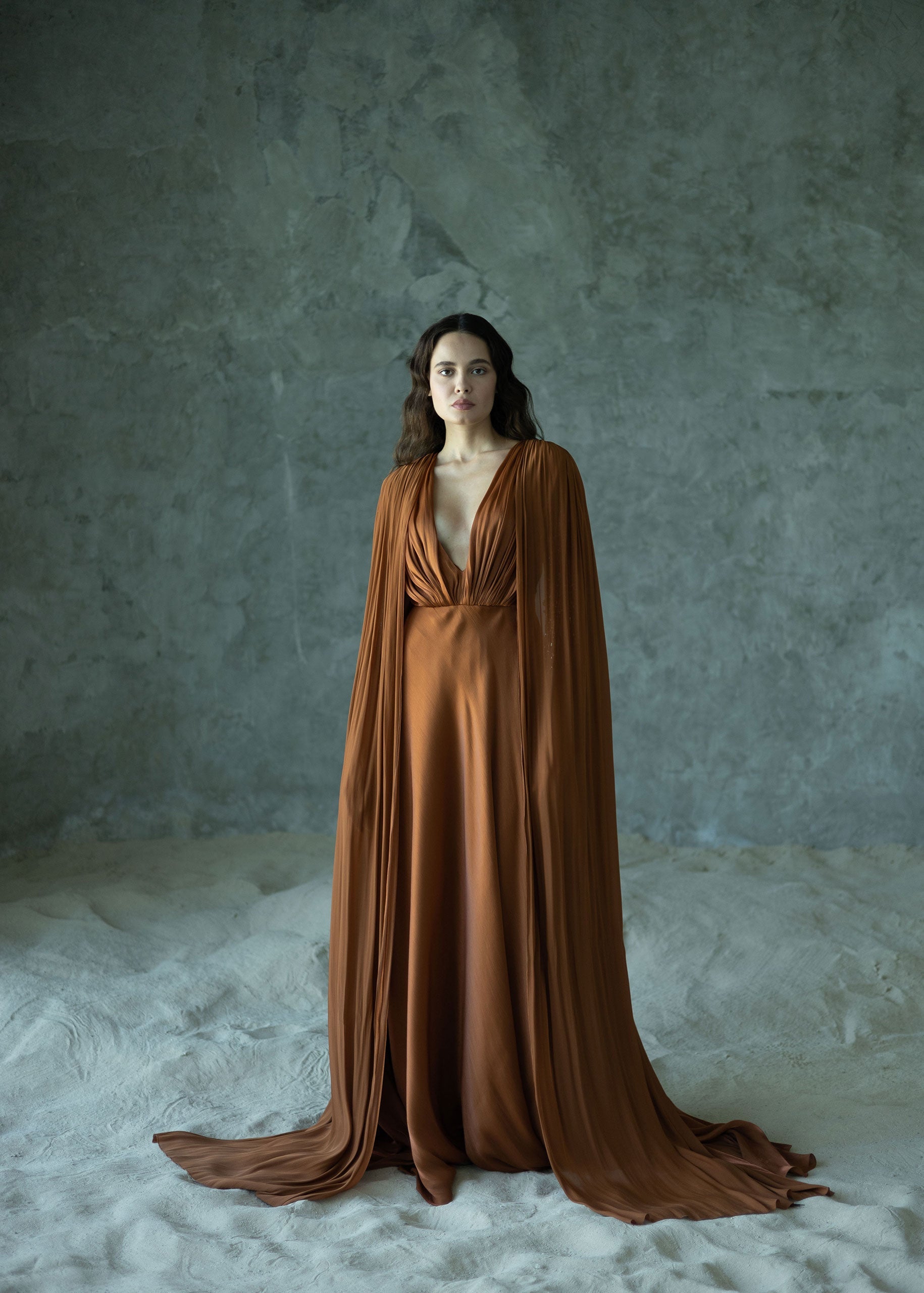 - The sleeves are in a cape style and they are very flowy in the same length as the dress from the sides and longer from the back.