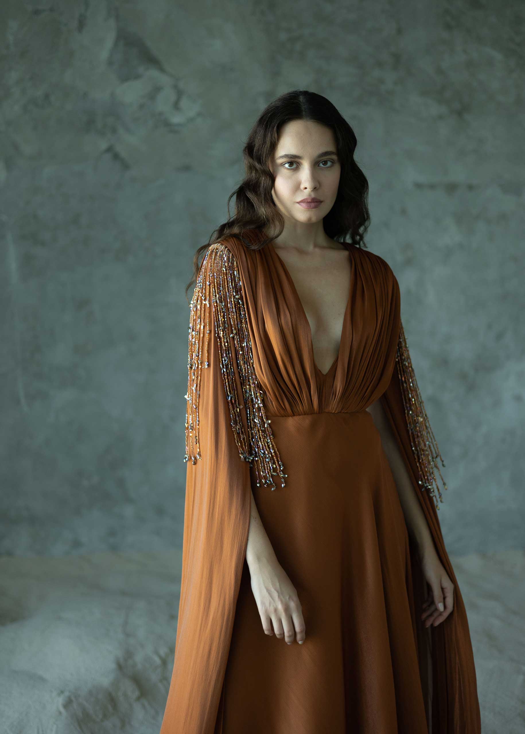 - A daring occasion dress made of Chiffon Organza fabric and designed with unique handmade fringes on the shoulder.