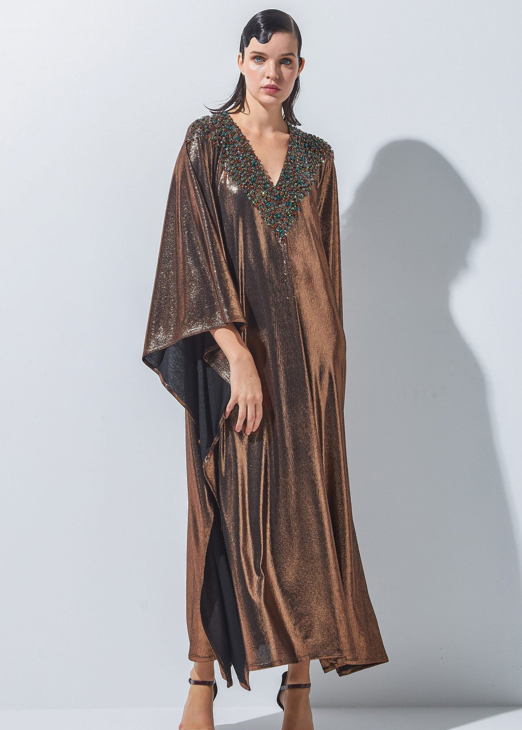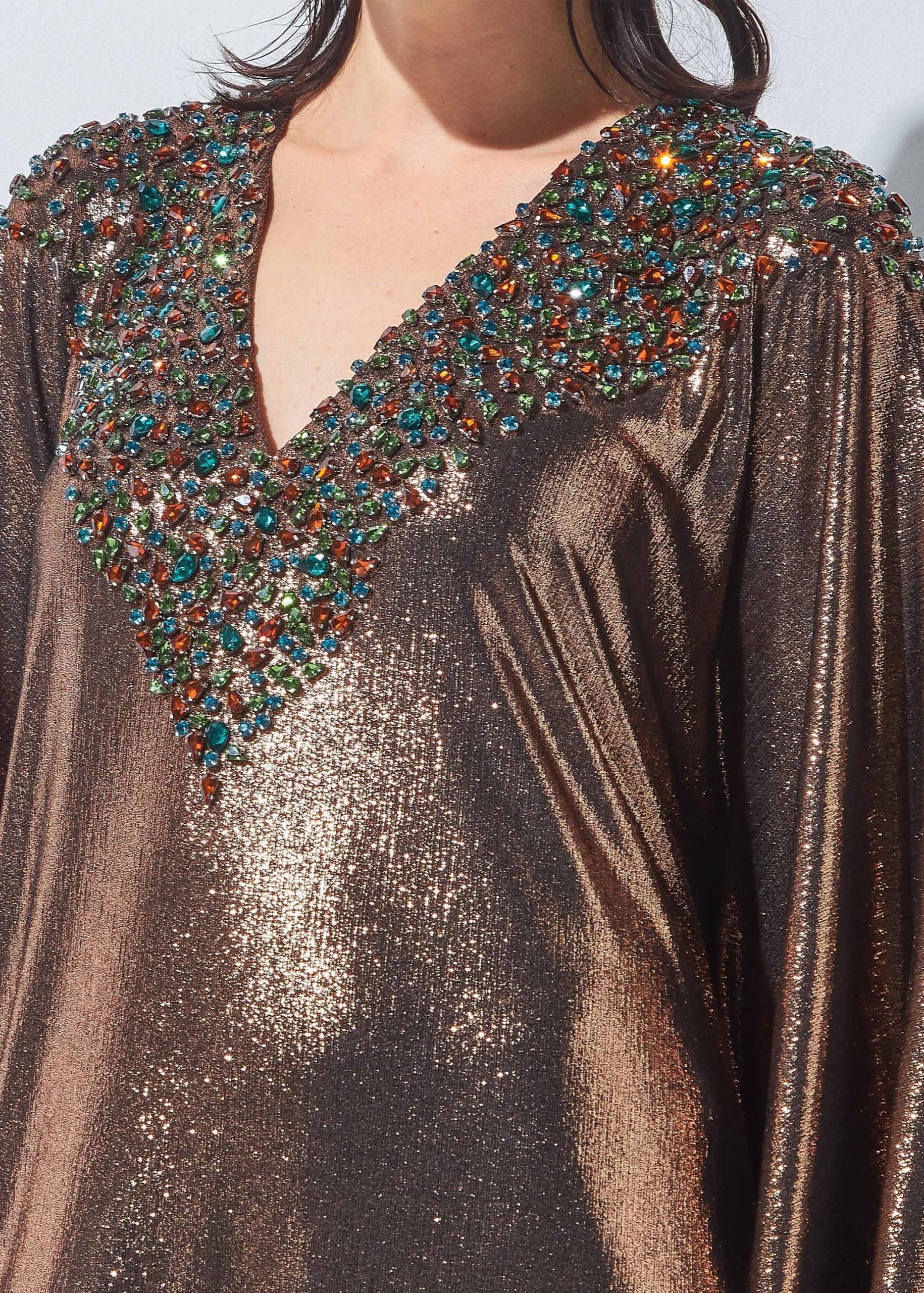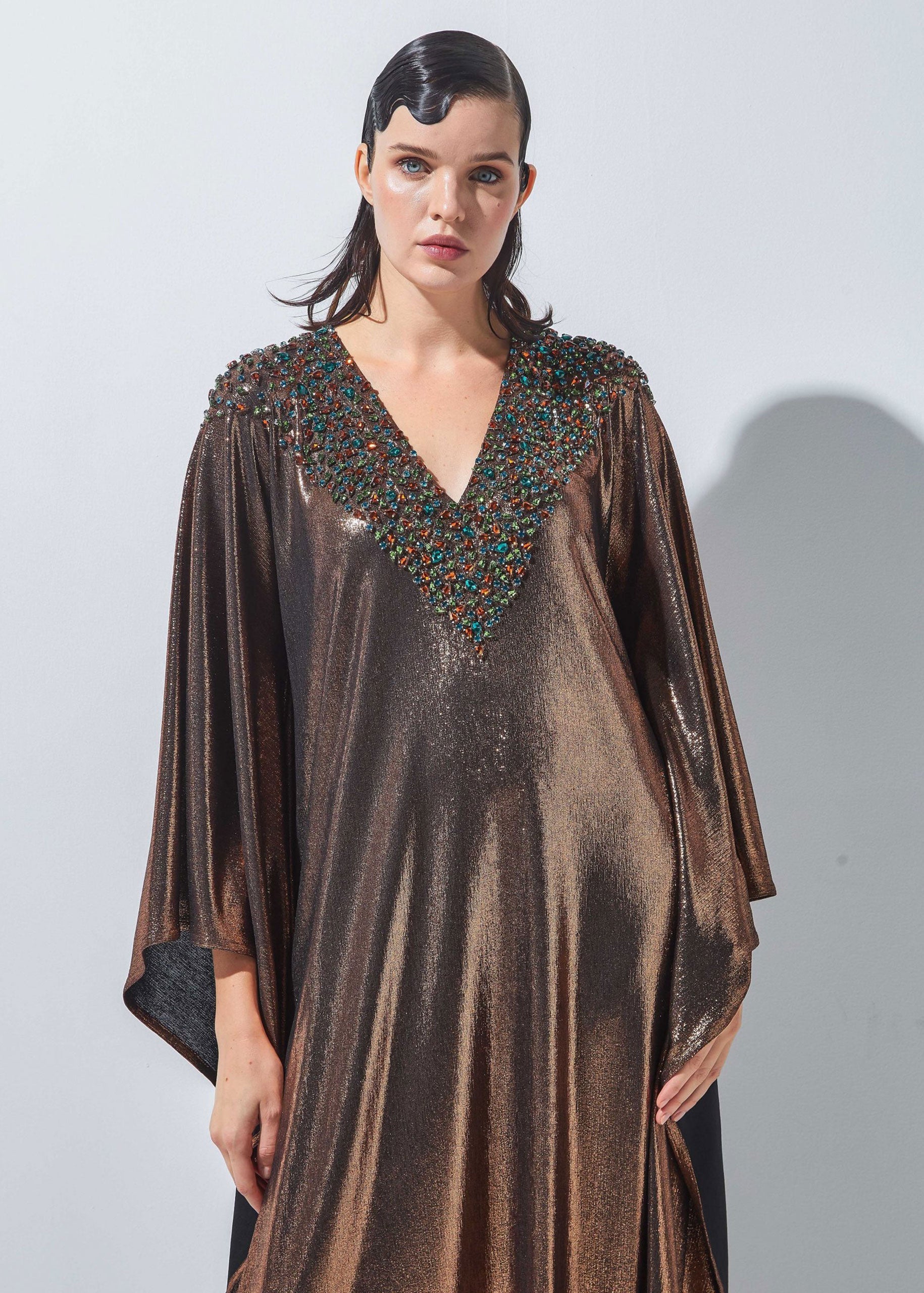 - A shimmering long dress made of unique stretchable fabric and designed with crystals.