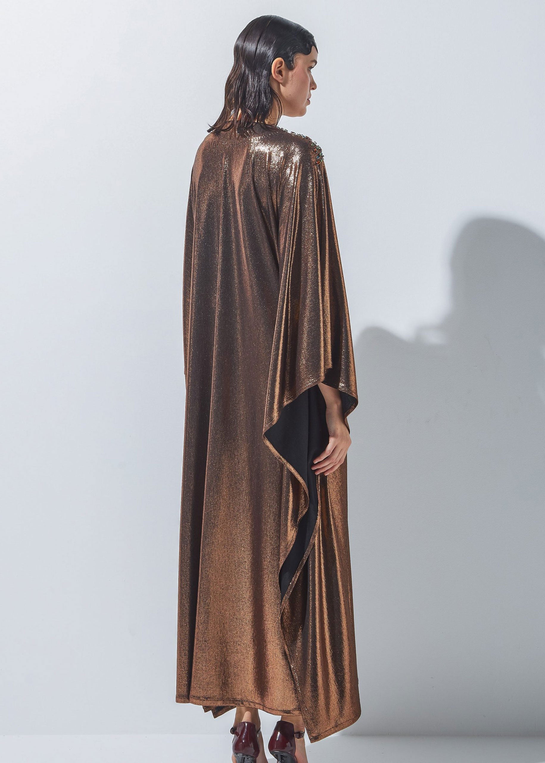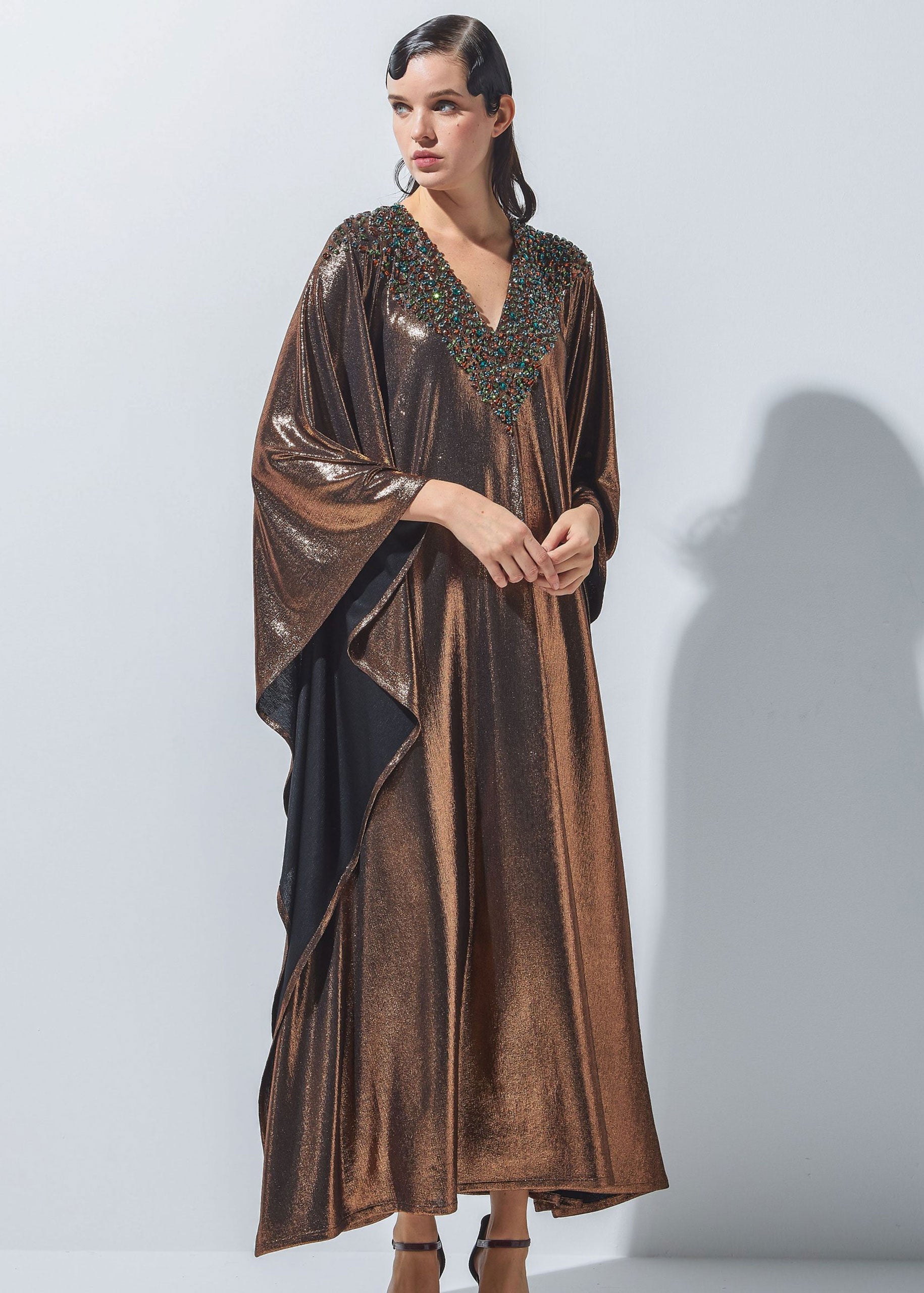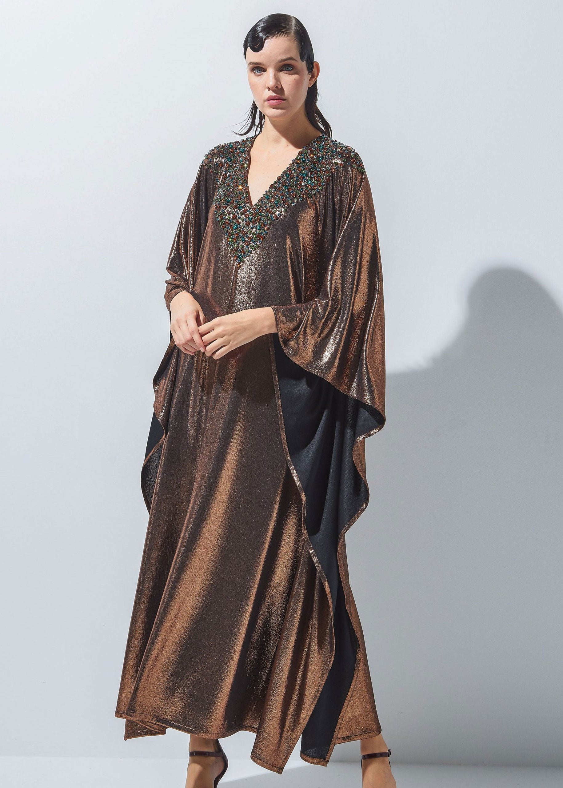 - A shimmering long dress made of unique stretchable fabric and designed with crystals.